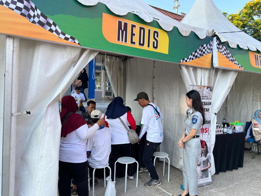 Palembang – Jasa Raharja Sumsel berkolaborasi Bersama Balai Pengelola Transportasi Darat Kelas II Sumsel dengan Dalam rangka pelaksanaan pekan keselamatan jalan ( PKJ ) tahun 2024 yang mengangkat tema Lintas Batas, Langkah Pintar & Cerdas berkendara untuk keselamatan yang dilaksanakan pada hari minggu 27 Oktober 2024, Jasa Raharja Cabang Sumsel ikut berpartisipasi dengan melakukan kegiatan MUKL pemeriksaan kesahatan gratis di lapangan Kantor BPTD Kelas II Sumatera Selatan .
